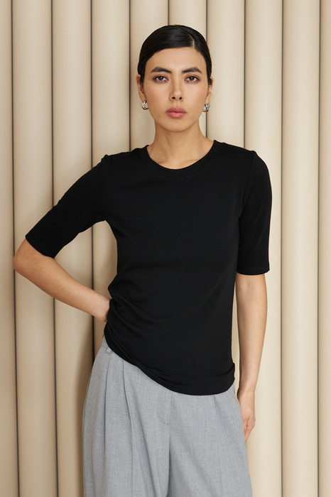 Джемпер прилегающего силуэта из эластичного полотна. Втачной короткий рукав. Круглый вырез горловины оформлен бейкой. Джемпер – это хорошая базовая вещь, подходящая для любого гардероба.