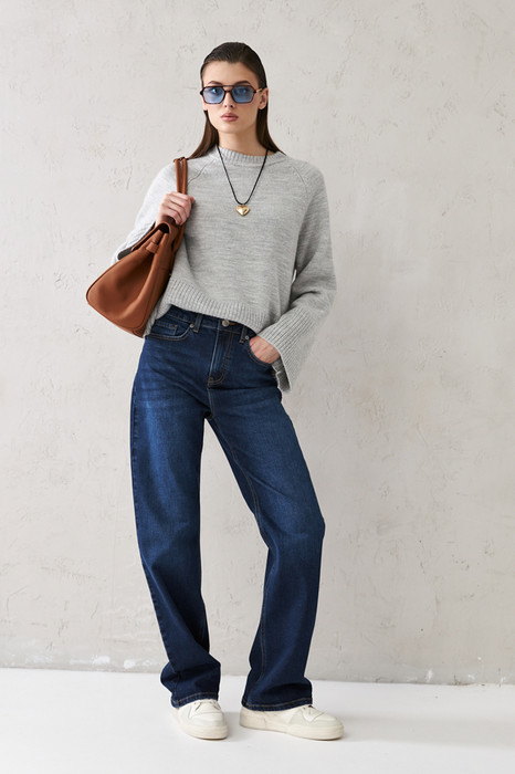 Брюки из эластичного денима выполнены по классической джинсовой технологии (варка с эффектом легкого выбеливания). Прямой классический крой. На задней части брюк выполнены накладные карманы, на передней - карманы с подкройным бочком. Притачной пояс со шлёвками. Застёжка на молнию-гульфик и пуговицу.