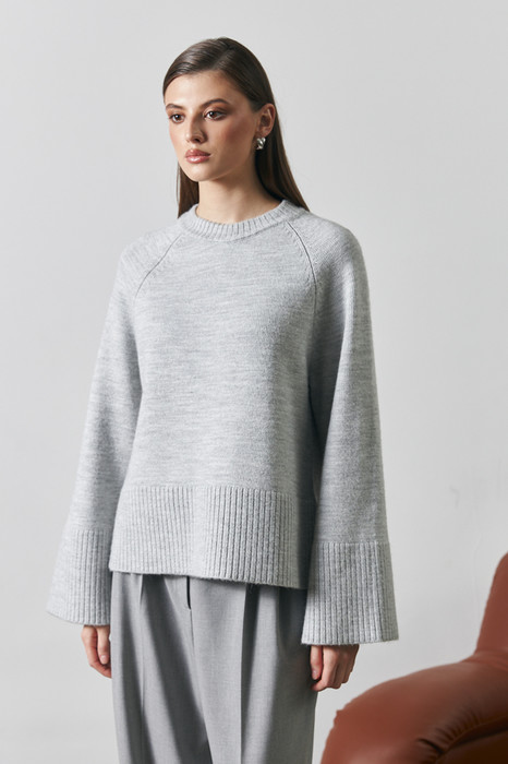 Джемпер свободного силуэта. Длинный рукав-реглан, чуть расширенный книзу. Круглый вырез горловины оформлен резинкой, низ изделия и низ рукава-высокой резинкой. Изделие выполнено из мягкой меланжевой пряжи.