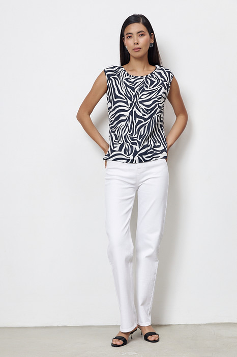 Топ из вискозной ткани с сатиновым блеском. Свободный силуэт, с небольшими разрезами в боковых швах. Круглый вырез горловины и линии проймы окантованы косыми бейками из основной ткани.