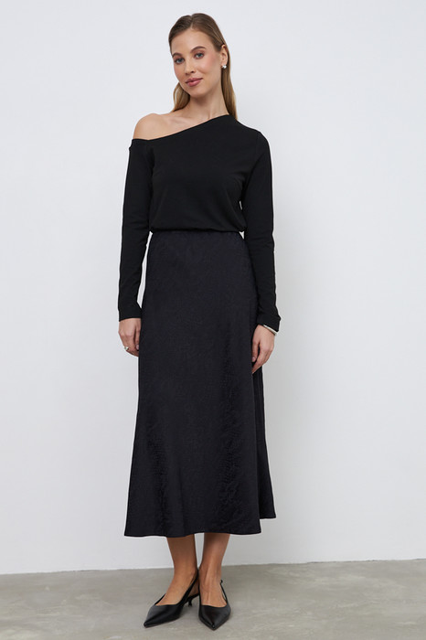 Юбка, слегка расширенная книзу из вискозной ткани с вытканным жаккардовым узором "рептилия". Крой юбки по косой, на линии талии скрытая резинка.