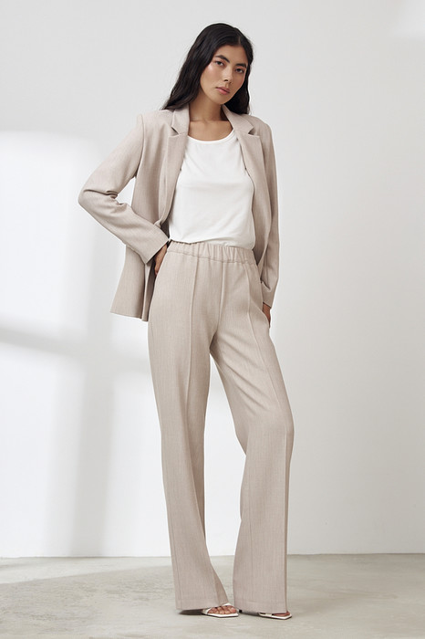 Брюки прямого силуэта из меланжевой костюмной ткани. Пояс притачной с эластичной резиной.
