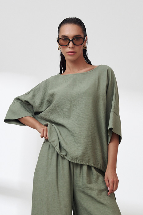 Блуза из вискозной ткани с крэш-эффектом. Очень свободный силуэт с небольшими разрезами по бокам. Круглый вырез горловины. Цельнокроеный рукав с притачной манжетой. Низ изделия затягивается на кулиску.