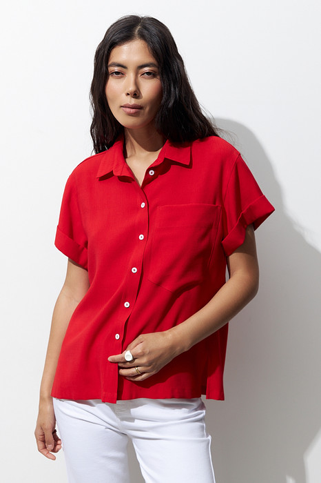 Рубашка из вискозной ткани с крэш-эффектом. Свободный силуэт с разрезами в боковых швах и застёжкой на планке. Вырез горловины обработан отложным воротником на стойке. Короткий рубашечный рукав с отворотом. На задней части изделия выполнена кокетка с небольшой складкой. На передней-накладной карман в области груди.