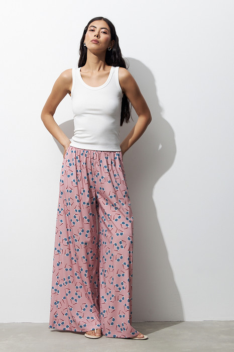 Брюки прямого свободного силуэта из вискозной ткани. Пояс притачной с эластичной резиной, в боковых швах карманы.