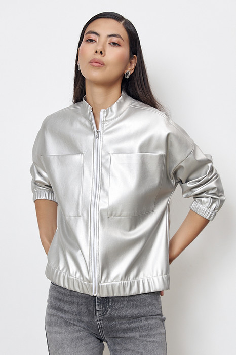 Жакет-бомбер из эластичного полотна, с покрытием, имитирующим кожу. Свободный силуэт с застёжкой-молнией и накладными карманами. Рукав втачной в спущенную пройму. Нижняя часть рукава и низ изделия присборены на резинку. Линия горловины оформлена воротником-стойкой.
