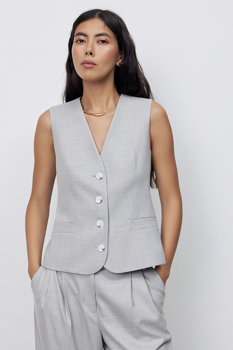 Жилет полуприлегающего силуэта с застёжкой на пуговицы из меланжевой костюмной ткани. На передней части изделия нагрудные вытачки переведены в рельефы и линию кармана. Карманы прорезные, с листочкой. Спинка со средним швом, рельефами и плечевыми вытачками. Длина жилета до уровня линии бедер. Жилет на притачной подкладке.