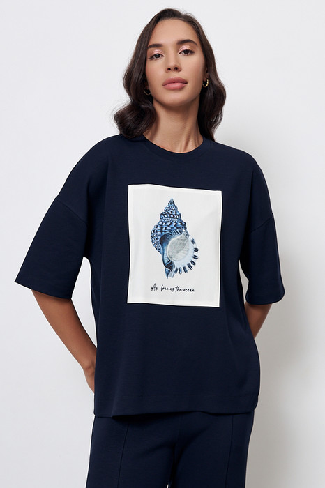 Джемпер свободного силуэта со спущенной линией плеча и рукавом до локтя выполнен из эластичного полотна. Вырез горловины оформлен бейкой из основной ткани. На передней части изделия выполнена аппликация. В таблице размеров представлены параметры человека, а не изделия.
