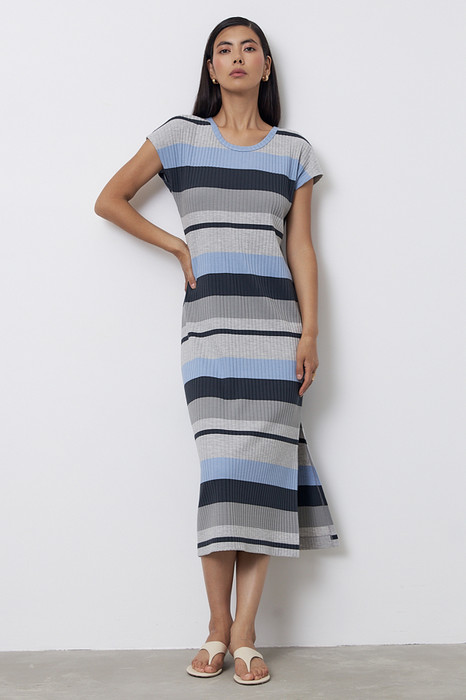 Платье из эластичного полотна. Полуприлегающий силуэт с разрезом в боковом шве. Круглый вырез горловины, цельнокроеный короткий рукав.