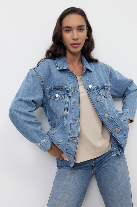 Джисовая куртка из денима выполнена по классической джинсовой технологии. Свободный силуэт с застёжкой на пуговицы. Изделие со спущенной линией плеча и длинным рукавом на манжете с застёжкой на пуговицы. Вырез горловины обработан отложным воротником на стойке. На передней части выполнены карманы с листочкой и накладные карманы с клапаном в области груди. Швы оформлены декоративными строчками.