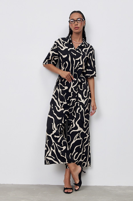 Стильный комбинезон из комфортной вискозной ткани. Свободный силуэт с застёжкой на пуговицы, в боковых швах карманы. Втачной короткий рукав. Вырез горловины обработан отложным воротником на стойке. Изделие с заниженной линией сидения обеспечивает комфортное движение. В комплекте пояс из основной ткани.