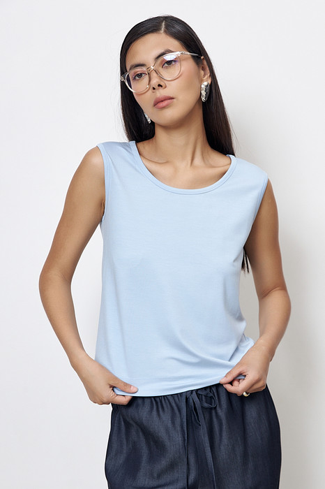 Топ из эластичного полотна полуприлегающего силуэта. Линия горловины и линия проймы окантованы эластичной бейкой.