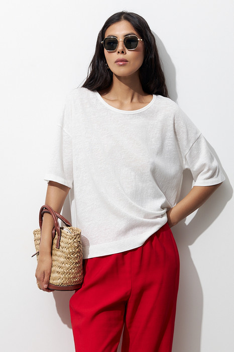 Джемпер из хлопкового эластичного полотна. Свободный силуэт со спущенной линией плеча и рукавом до локтя. Вырез горловины окантован эластичной бейкой. В таблице размеров представлены параметры человека, а не изделия.
