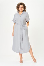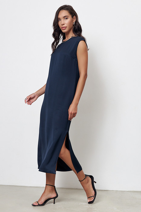 Платье из вискозной ткани с сатиновым блеском. Полуприлегающий силуэт, с разрезом в боковом шве. По среднему шву спинки застёжка на петлю-пуговицу. Круглый вырез горловины и линия проймы окантованы косыми бейками из основной ткани.