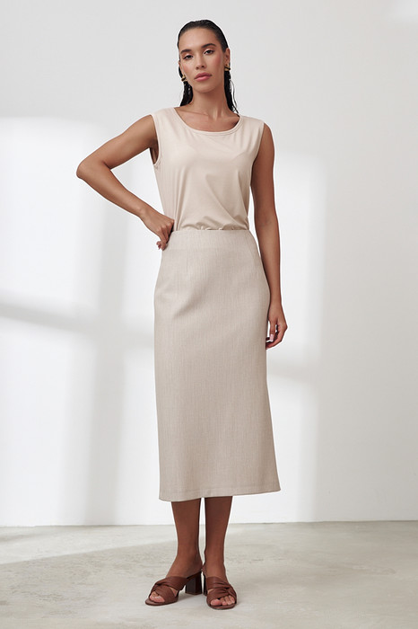 Юбка из меланжевой костюмной ткани прилегающего силуэта. Сзади по среднему шву застёжка-молния, снизу шлица с разрезом. Изделие без пояса, верхний срез обработан обтачкой. На передней и задней половине юбки выполнены талиевые вытачки. Юбка на притачной подкладке.