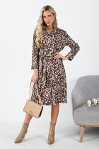 Платье приталенного силуэта из хлопковой плательной ткани. Изделие отрезное по линии талии с защипами. В боковых швах карманы. Втачной короткий рукав. Притачная планка с застёжкой на пуговицы. Вырез горловины обработан отложным воротником на стойке. В комплекте пояс из основной ткани.