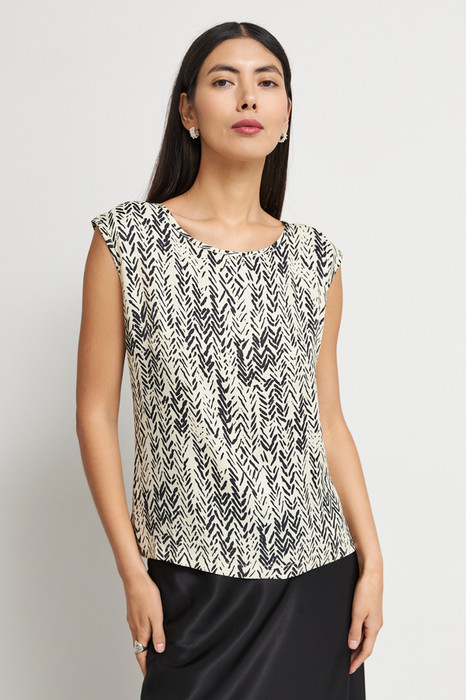 Топ из вискозной ткани с сатиновым блеском. Свободный силуэт, с небольшими разрезами в боковых швах. Круглый вырез горловины и линии проймы окантованы косыми бейками из основной ткани.