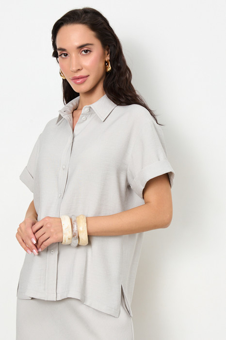 Рубашка из вискозной ткани с крэш-эффектом. Свободный силуэт с разрезами в боковых швах и застёжкой на планке. Вырез горловины обработан отложным воротником на стойке. Короткий рубашечный рукав с отворотом. На задней части изделия выполнена кокетка с небольшой складкой.