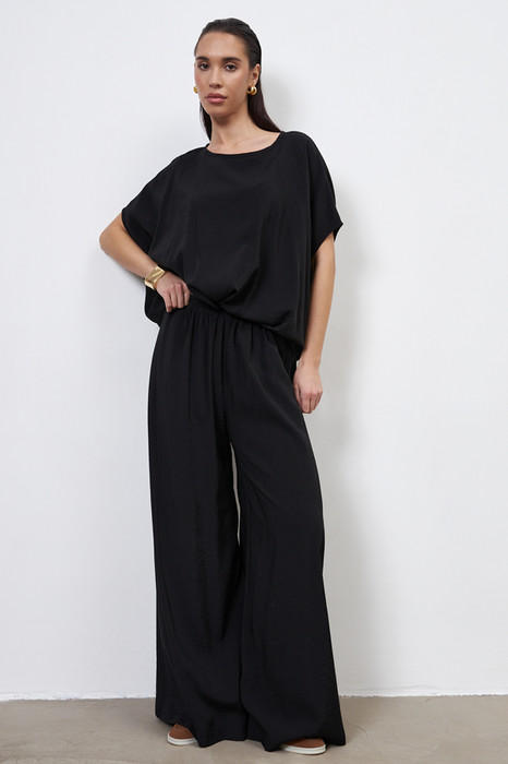 Брюки прямого силуэта из вискозной ткани с крэш-эффектом. Пояс с эластичной резиной, в боковых швах карманы.