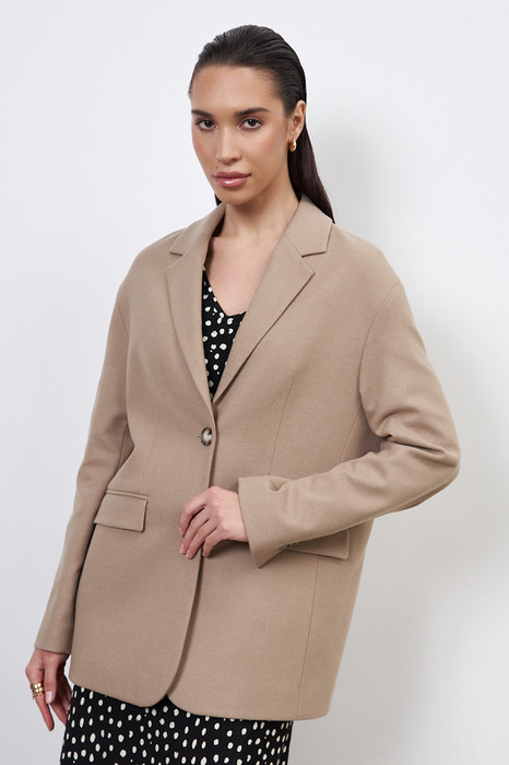 Жакет из костюмной ткани полуприлегающего силуэта. Изделие с английским воротником и застежкой на пуговицы. На передней части жакета выполнены карманы в рамку с клапаном. По центру задней части выполнена шлица - элемент декоративный и необходимый. Обеспечивает свободу движения, добавляет шику и элегантности. Длинный рукав, снизу имитация шлицы с пуговицами. Жакет на подкладке.