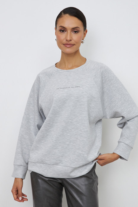 Свитшот свободного силуэта из эластичного полотна. Круглый вырез горловины оформлен бейкой. Рукав реглан с горизонтальным швом в области локтевого сгиба. По низу изделия и рукавов выполнены притачной пояс и манжеты из основной ткани. В таблице размеров представлены параметры человека, а не изделия.