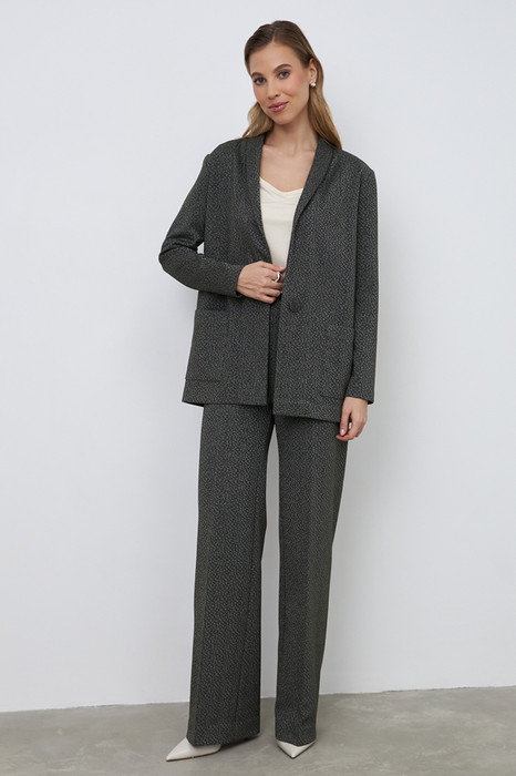 Костюм из эластичного полотна. Брюки прямого силуэта. Пояс с эластичной резиной. Жакет прямого свободного кроя с женственным шалевым воротником. На передней части изделия застёжка на пуговицу и накладные карманы. Втачной рукав. Изделие с плечевыми накладками, которые при желании можно убрать.