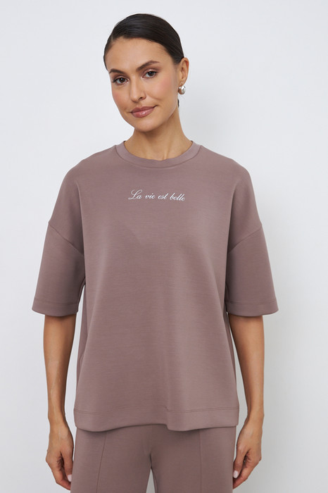 Джемпер свободного силуэта со спущенной линией плеча и рукавом до локтя выполнен из эластичного полотна. Вырез горловины оформлен бейкой из основной ткани. В таблице размеров представлены параметры человека, а не изделия.