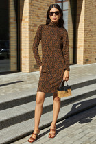 Платье из меланжевого эластичного полотна. Изделие свободного силуэта со спущенной линией плеча и длинным рукавом. Вырез горловины оформлен бейкой из основной ткани. В таблице размеров представлены параметры человека, а не изделия.