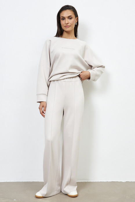 Брюки прямого силуэта из эластичного полотна. Пояс с эластичной резиной. На передней части брюк застрочены стрелки.