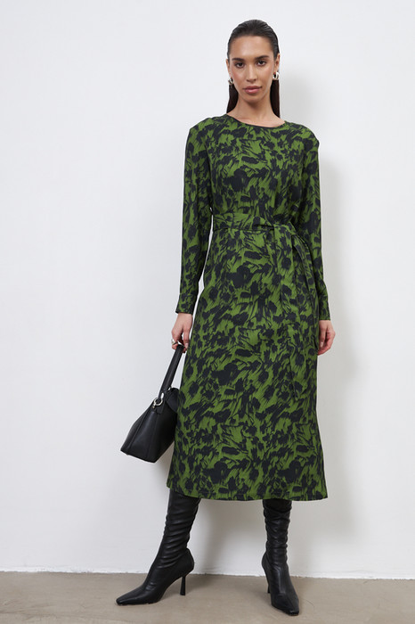 Платье из вискозной ткани полуприлегающего силуэта. Втачной длинный рукав на манжете с застёжкой на пуговицы. На задней части изделия застежка на петлю-пуговицу, снизу выполнен разрез. Круглый вырез горловины оформлен косой бейкой. В комплекте пояс из основной ткани.