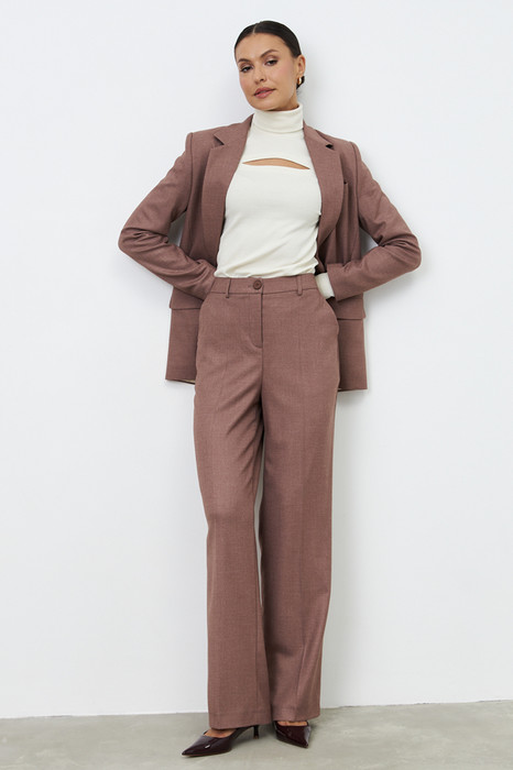Брюки из костюмной ткани прямого силуэта. Застёжка на молнию-гульфик и пуговицу. В боковых швах выполнены карманы с подкройным бочком. Притачной пояс со шлёвками. На задней половинке брюк карманы в рамку с пуговицей, на поясе вставка с резиной.