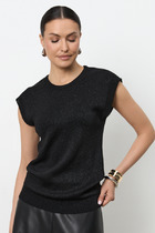 Джемпер свободного силуэта со спущенной линией плеча. Низ изделия, линия проймы и круглый вырез горловины оформлены резинкой. Изделие выполнено из мягкой структурированной пряжи.