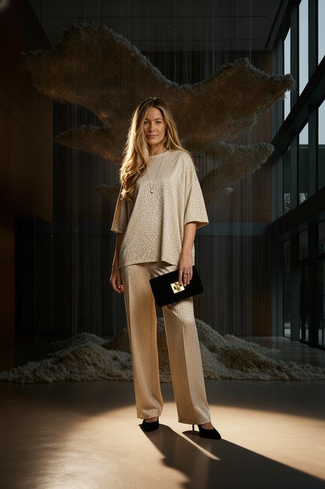 Костюм из эластичного полотна. Джемпер свободного силуэта со спущенной линией плеча и рукавом до локтя. Вырез горловины оформлен бейкой из основной ткани. Брюки прямого силуэта. Пояс с эластичной резиной. На передней части брюк застрочены стрелки.