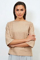 Блуза из плательной ткани свободного силуэта. Вырез горловины «лодочка», сзади застёжка на петли-пуговицы. Цельнокроеный длинный рукав-летучая мышь.
