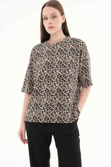 Джемпер свободного силуэта со спущенной линией плеча и рукавом до локтя выполнен из эластичного полотна. Вырез горловины оформлен бейкой из основной ткани. В таблице размеров представлены параметры человека, а не изделия.
