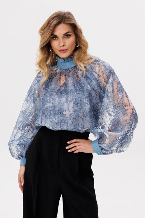 Блузка выполнена из органзы. Блузка прямого силуэта, длиной до линии бедер. Перед и спинка цельные, со сборкой по горловине. Застежка сзади на две петли и пуговицы. Воротник-стойка декорирован рюшами по верхнему краю. Рукав покроя "реглан", одношовный, со сборкой по горловине и низу. Низ рукава на притачной манжете из джинса, застегивающейся на пуговицу. В комплект входит съемный топ на регулируемых бретелях. Топ прямого силуэта, длиной до линии бедер.