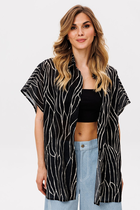 Блузка выполнена из плательно-блузочной ткани с принтом. Блузка прямого покроя, длиной до линии бедер. Спереди застежка с планкой на пуговицы. Спинка цельная. Воротник стояче-отложной. Плечевой шов удлинен. Рукав покроя "кимоно", длиной выше линии локтя.