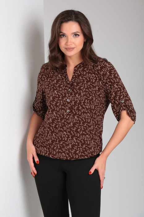 Женская блузка свободного силуэта с втачным рукавом. По переду изделия нагрудные вытачки и центральная планка, застегивающаяся на пуговицы. На левой полочке накладной карман. Спинка с кокеткой переходящей на полочку. По центру спинки сборка. Рукав до локтя, прямой, втачной с патой на застежку пуговицу. По горловине плоско лежащий воротник-стойка. Низ блузки на резинке.