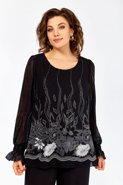 Блузка А-силуэта из нежной шифоновой ткани с лёгким эффектом «жатки», на подкладке из шифона. Полочка с нагрудными выточками, спинка без особенностей. Горловина круглая. Рукав втачной длинный по окату со сборкой, в нижней части собран на эластичную нить, которая внизу образует рюшу высотой 6 см.