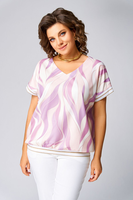 Блузка из мягкой вискозной ткани свободного силуэта со спущенной линией плеча. Полочка цельная, спинка с центральным швом. Горловина V-образной формы. Низ блузки и низ цельнокроенного рукава обработаны декоративным трикотажным довязом.