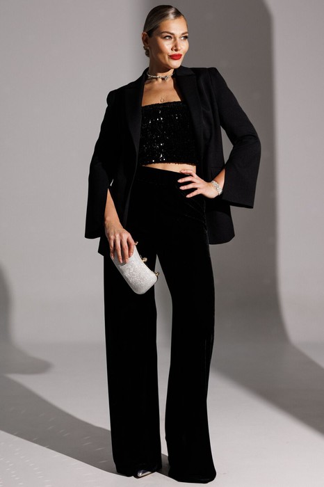 В предпраздничной суете так важно чувствовать себя комфортно, не жертвуя шиком. Наши велюровые брюки созданы именно для этого. Их струящийся силуэт и мягкий, глубокий черный цвет добавляют образу лоска, а тактильное наслаждение от ткани останется с Вами на весь вечер. Брюки с высокой посадкой, с притачным поясом на резинке, без боковых швов, слегка расширенные к низу. Наденьте наш бархатный жакет с велюровыми брюками - и Вы получите ансамбль тотальной гармонии. Дополните образ топом из пайеток - образ получается смелым. Легкая небрежность велюра и безупречная линия костюмного жакета создают тот самый сплав комфорта и стиля. Создайте безупречный новогодний гардероб вокруг наших велюровых брюк.