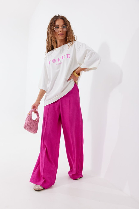 Брюки прямые из струящейся ткани. Верх на поясе со шлевками. По спинке пояс собран на резинку. Застежка по переду на молнию и пуговицу на поясе. В боковых швах карманы.