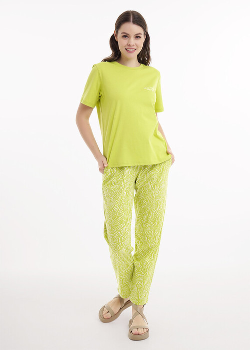Женские домашние брюки прямого силуэта из набивного хлопкового полотна. Пояс на резинке, спереди выполнены карманы с отрезным бочком.