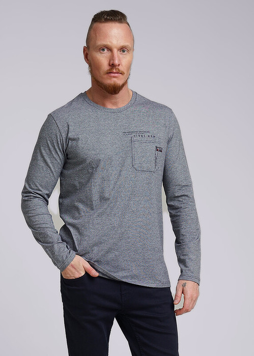 Лонгслив мужской с округлой горловиной и карманом. Прекрасно впишется в любой гардероб, станет отличным дополнением к брюкам или джинсам. Интересное звучание модели придает дизайнерская нашивка и принт.