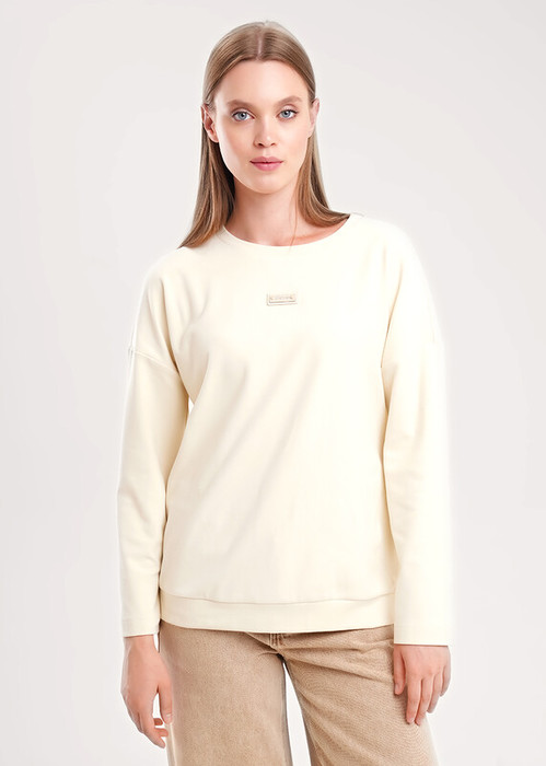 Джемпер свободного кроя из трикотажного полотна интерлок с начесом. Спущенный длинный рукав. Округлая горловина с обтачкой. Спереди нашивка. Сзади по спинке средний шов. По низу изделия манжет.