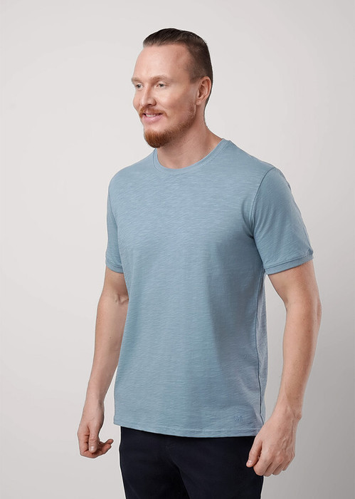 Футболка мужская с округлой горловиной и коротким втачным рукавом из фактурного полотна ""флам"". Изделие дополнено имиджевым принтом в цвет полотна. Данная модель прекрасно комбинируется с джинсами или шортами благодаря своей универсальности.