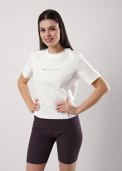 Футболка для дома и отдыха из трикотажного полотна рибана с эластаном. Укороченная, объемного силуэта. Короткий втачной рукав. Округлая горловина с широкой обтачкой. На детали переда вертикальные резы с контрастным застилом, принт.