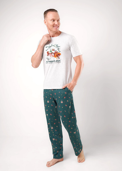 Набор мужской, состоящий из футболки и брюк. Футболка из хлопковой кулирной глади с коротким рукавом , спереди авторский принт. Брюки из набивной кулирной глади на широком поясе с резинкой и шнуром, по бокам удобные карманы.
