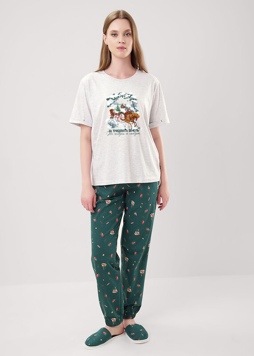 Набор одежды из трикотажного полотна.Футболка с коротким втачным рукавом,отворотом и закрепкой. По горловине обтачка.Спереди принт, нашивка в боковом шве. Брюки с поясом на резинке и киперной лентой. Боковые карманы с отрезным бочком. Внизу брюк резинка.