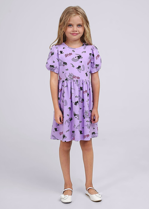 Стильное хлопковое платье для маленькой принцессы на каждый день. Короткий рукав, завышенная талия и юбка на сборке. Комфортная посадка подарит свободу в движении и уют, интересные набивки добавят изюминку в твой образ.